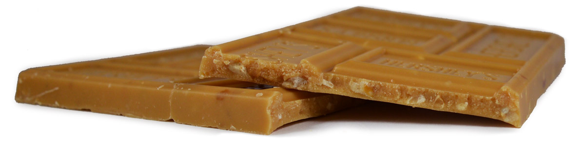 Nutritional info (1 bar, 39 grams): 210 calories, 13 grams of fat (7 grams of saturated fat, 0.2 grams of trans fat), 5 mg of cholesterol, 85 mg of sodium, 21 grams of carbohydrates, 0 grams of fibre, 19 grams of sugar, 3 grams of protein.